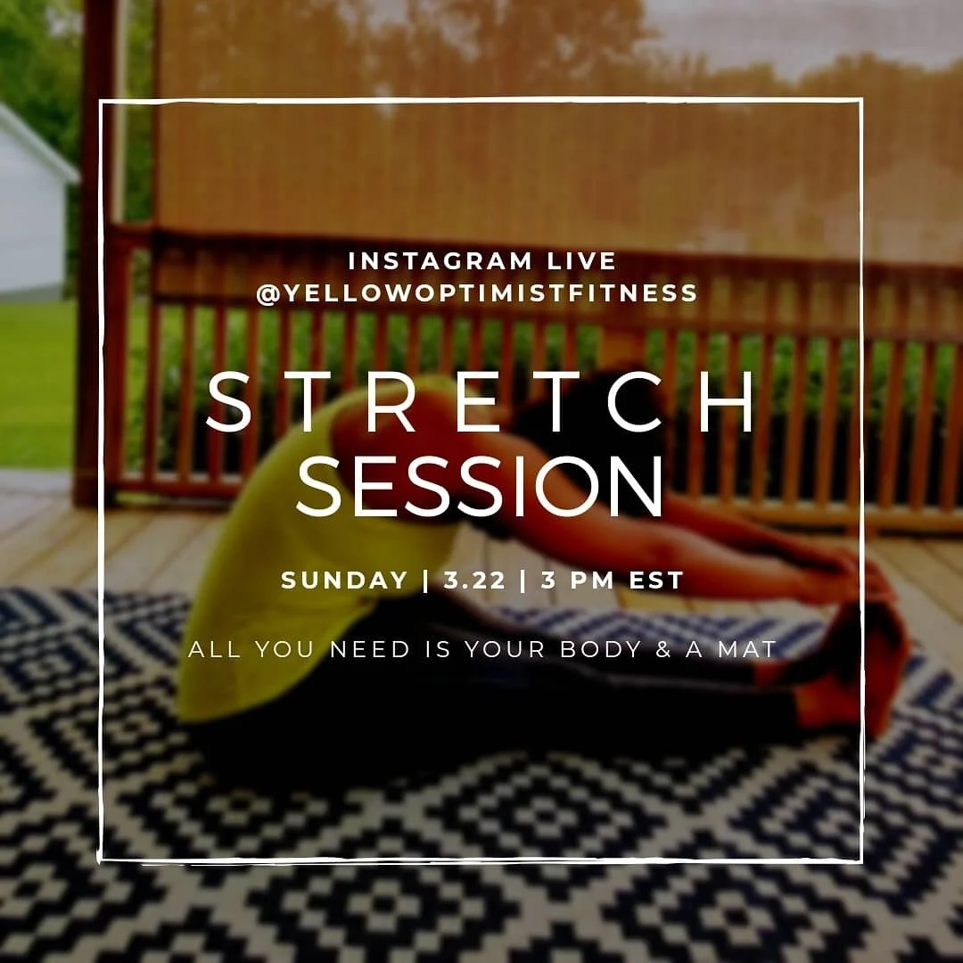 Stretching is a wonderful way to care for ourselves, connect with our bodies, release stress, and reset. Join me this Sunday to do just that! We'll breathe through several movements to release tension in our muscles and explore our range of motion. The session is open to all fitness levels and should leave participants feeling free and relaxed. It will be offered live on Instagram so be sure to follow Denise @yellowoptimistfitness and look for her live post to begin a few minutes before 3PM EST. Feel free to contact Denise with questions via IG @yellowoptimistfitness or via email at denise.nichelle@gmail.com